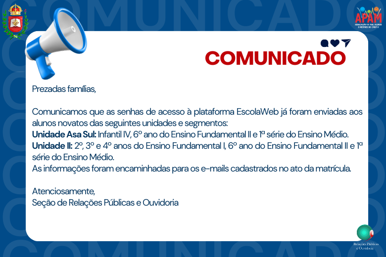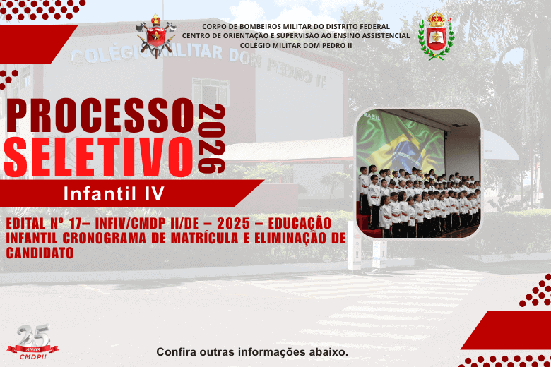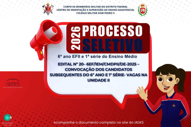 O Corpo de Alunos do Colégio Militar Dom Pedro II convoca todos os novos alunos do 6º ano do Ensino Fundamental II e da 1ª série do Ensino Médio, das unidades Asa Sul e Unidade II Taguatinga/Ceilândia, regidos pelo processo seletivo do EDITAL Nº 01 – 6EF/1EM/CMDPII/DE-2025, para participarem da semana de adaptação, conforme as informações abaixo: